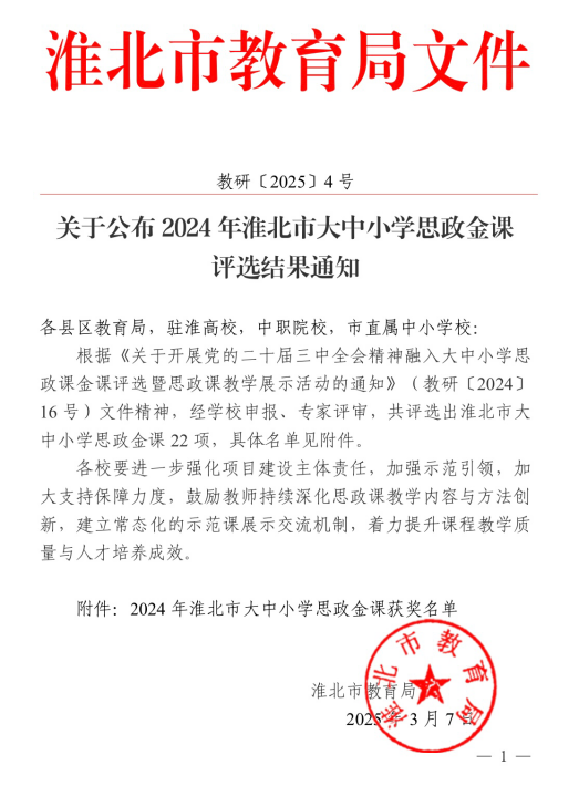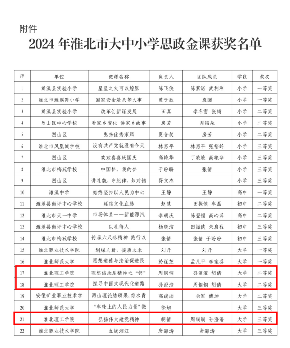 日前,在由淮北市教育局组织开展的党的二十届三中全会精神融入大中小学思政课金课评选暨思政课教学展示活动中,十大买球的正规网站十大买球的正规网站孙澄澄、周铜铜、胡倩等三位思政教师凭借创新的教学设计和精彩的课程呈现,在大学组评选中分别荣获二等奖、三等奖,展现了我校思政教师的卓越风采。