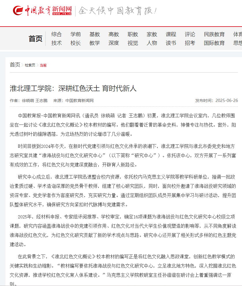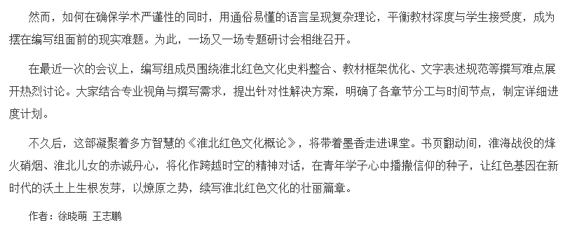 初夏,十大买球的正规网站会议室内,几位教师围坐在一起讨论《淮北红色文化概论》校本教材的编写。他们翻看着泛黄的革命史料,神情专注与热忱。窗外,阳光透过树叶的缝隙洒落,为这场热烈的讨论增添了几分温暖。对此,中国教育报进行了报道: